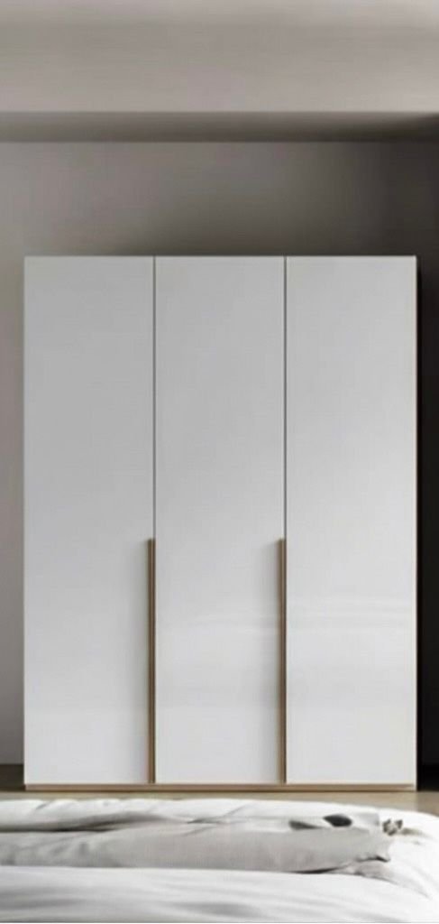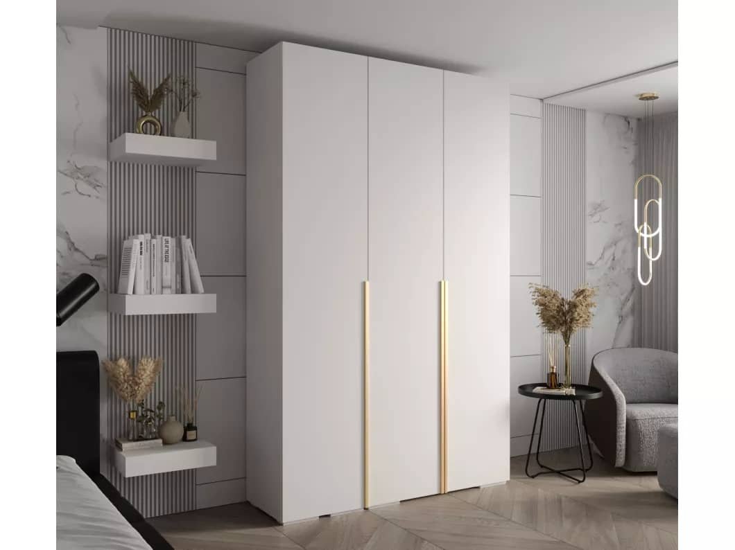 Armoire moderne à portes battantes de couleur blanche pure, qui donne un aspect épuré et lumineux. Longues poignées verticales avec une finition dorée pour créer un contraste élégant avec le blanc. Dimensions: 196cm/120cm/50cm