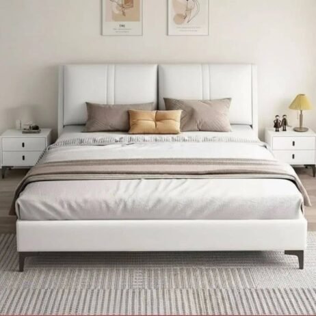 Lit moderne capitonné en tissu blanc, design épuré et lignes arrondies. Tête de lit matelassée et sommier intégré. Confortable et élégant, parfait pour une chambre contemporaine.